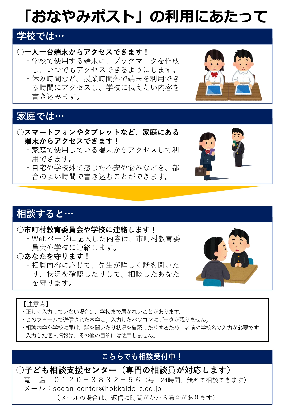 相談窓口 「すごく困っているけど、家族や先生には言いたくない」 「でも、本当は誰かに聞いてほしい」 「誰に相談したら良いのだろう…」 そんなときは、誰にも知られずに聞いてもらえる窓口がたくさんあります。 誰かに聞いてもらうだけで気持ちが楽になることもあります。 こんなことで電話してもいいのかな?…なんて考えず、困ったときは気軽に相談してみましょう。